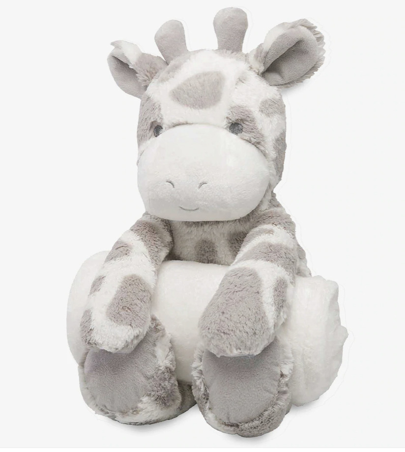 - Plush stuffed animal holding a 30″ x 38″ fleece baby blanket