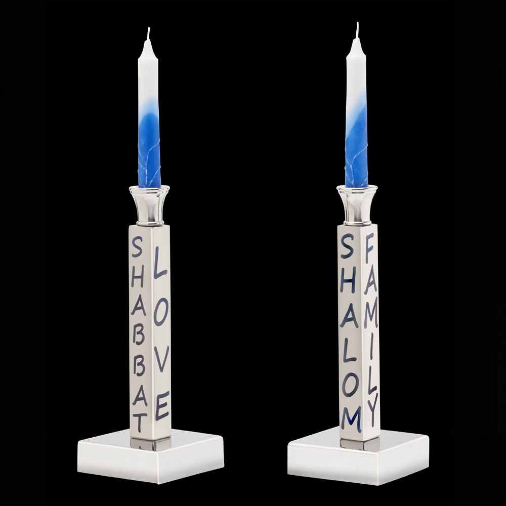 Add a little light & many warm smiles to your family’s traditions with beautiful candlesticks bearing words that will make everyone smile…Shabbat, Shalom, Love, Family, Gratitude, Love, Memories, Blessings & Traditions! Made of food-safe polished aluminum with stainless steel candle cups. Size: 8.75″x3.25″