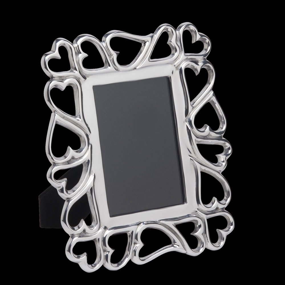 Shiny hearts dance elegantly around the edge of the Heart-to-Heart Picture Frame to create a joyful and timeless pattern celebrating all kinds of love. Perfect for a 5×7 pic of the happy couple, good friends or good times! Handcrafted of food-safe polished aluminum. Size: 11 x 9″ x 2.5″