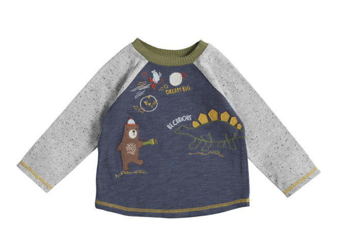 Cotton slub tee with speckle knit sleeves features open flap appliques.