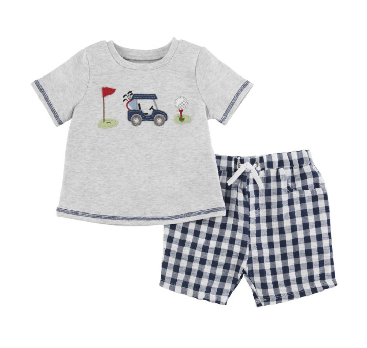 2-piece set. Short sleeve interlock tee with golf appliques. Comes with check seersucker pull-on shorts.
