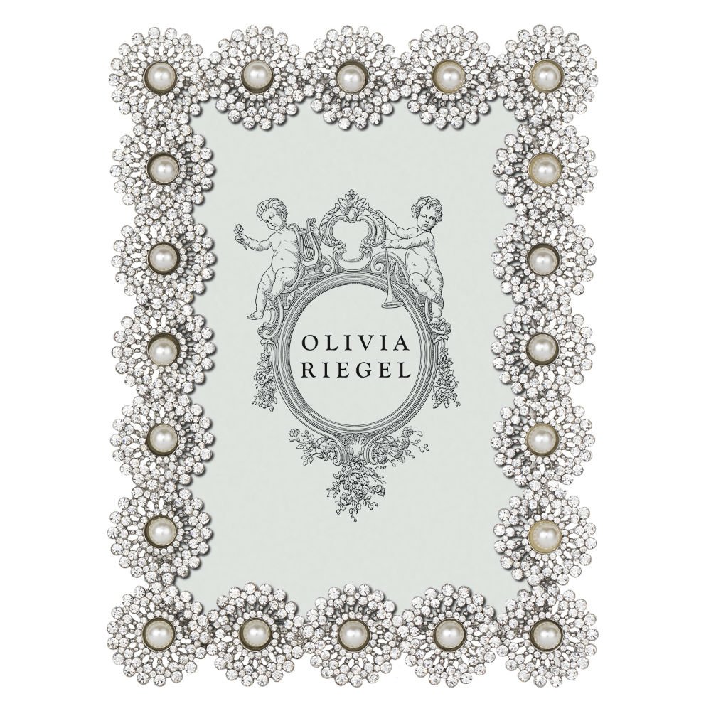 Stunning bursts of hundreds of hand-set clear European crystals and faux pearls in silver finished cast pewter. Elegant gray moiré silk back with easel for vertical or horizontal placement.