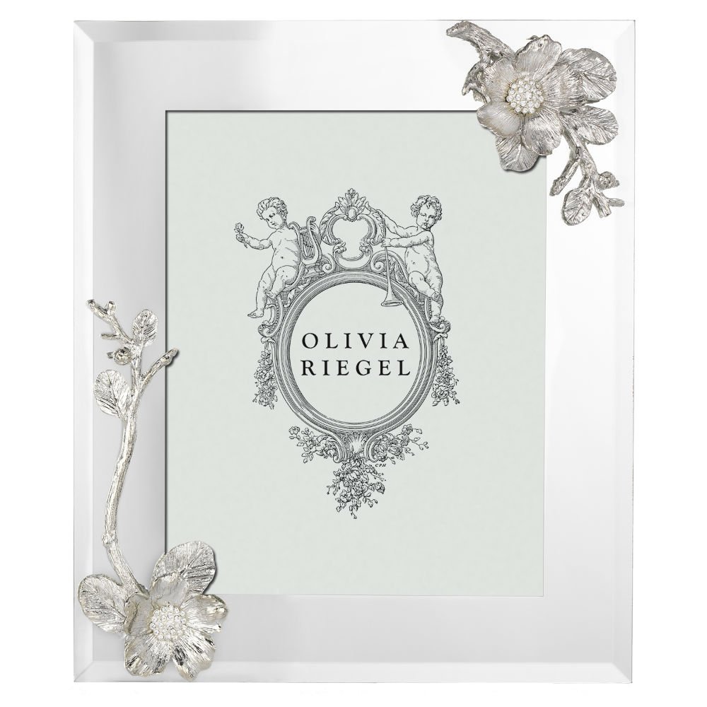 Mirrored glass with silver finished cast pewter blossoms. Hand-set clear European crystals. Elegant gray moiré silk back with easel designed for vertical or horizontal placement.